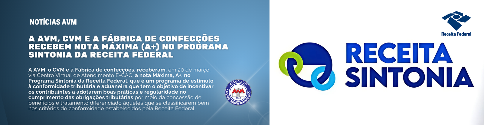 A AVM, o CVM e a Fábrica de confecções, receberam, em 20 de março, via Centro Virtual de Atendimento E-CAC, a nota Máxima, A+, no Programa Sintonia da Receita Federal, que é um programa de estímulo à conformidade tributária e aduaneira que tem o objetivo de incentivar os contribuintes a adotarem boas práticas e regularidade no cumprimento das obrigações tributárias por meio da concessão de benefícios e tratamento diferenciado àqueles que se classificarem bem nos critérios de conformidade estabelecidos pela Receita Federal.