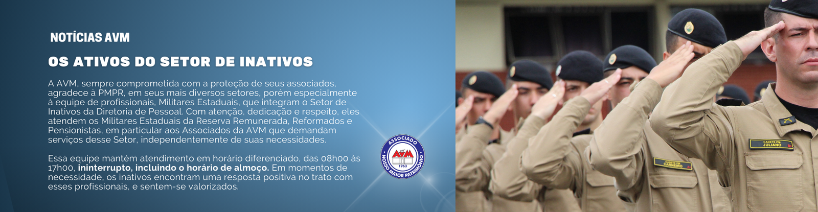 A AVM, sempre comprometida com a proteção de seus associados, agradece à PMPR, em seus mais diversos setores, porém especialmente à equipe de profissionais, Militares Estaduais, que integram o Setor de Inativos da Diretoria de Pessoal.