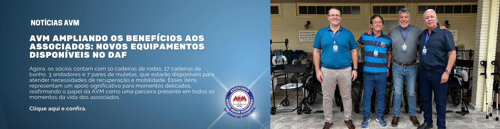 Agora, os sócios contam com 10 cadeiras de rodas, 17 cadeiras de banho, 3 andadores e 7 pares de muletas, que estarão disponíveis para atender necessidades de recuperação e mobilidade. Esses itens representam um apoio significativo para momentos delicados, reafirmando o papel da AVM como uma parceira presente em todos os momentos da vida dos associados.