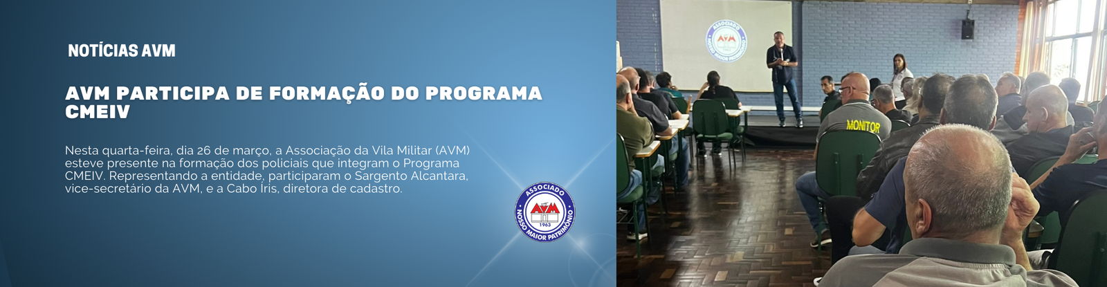 Nesta quarta-feira, dia 26 de março, a Associação da Vila Militar (AVM) esteve presente na formação dos policiais que integram o Programa CMEIV. Representando a entidade, participaram o Sargento PM RR Alcantara, vice-secretário da AVM, e a Cabo PM RR Íris, diretora de cadastro.