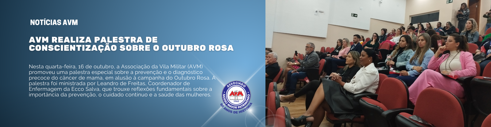 Nesta quarta-feira, 16 de outubro, a Associação da Vila Militar (AVM) promoveu uma palestra especial sobre a prevenção e o diagnóstico precoce do câncer de mama, em alusão à campanha do Outubro Rosa. A palestra foi ministrada por Leandro de Freitas, Coordenador de Enfermagem da Ecco Salva, que trouxe reflexões fundamentais sobre a importância da prevenção, o cuidado contínuo e a saúde das mulheres.