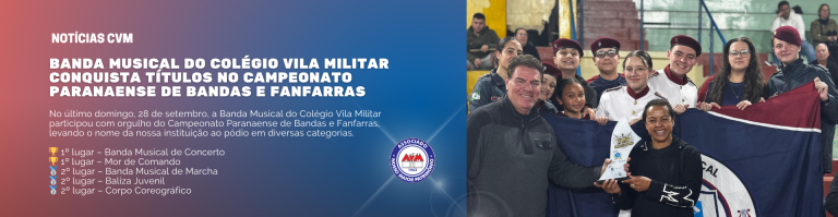 No último domingo, 28 de setembro, a Banda Musical do Colégio Vila Militar participou com orgulho do Campeonato Paranaense de Bandas e Fanfarras, levando o nome da nossa instituição ao pódio em diversas categorias. Com muito talento, dedicação e disciplina,…