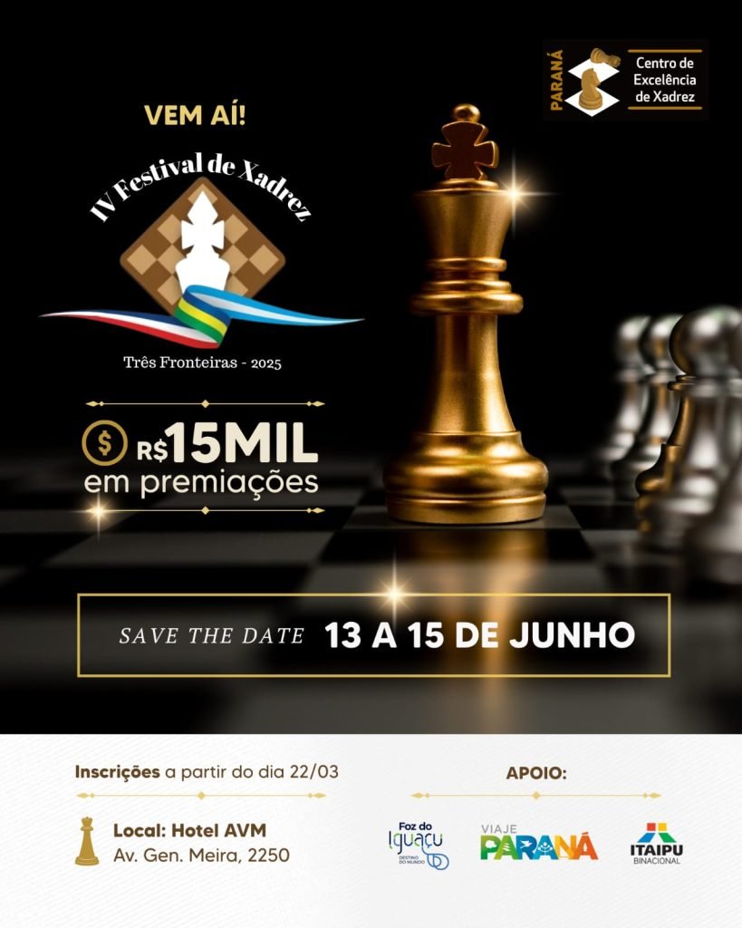 O Hotel Living Foz by AVM, em Foz do Iguaçu, será sede do IV Festival de Xadrez – Três Fronteiras 2025, um dos torneios mais aguardados da modalidade! O evento acontece entre os dias 13 e 15 de junho, reunindo enxadristas de diversas categorias para uma competição de alto nível.
