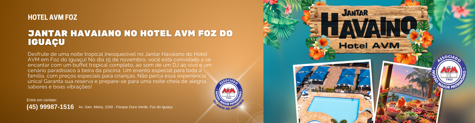 Desfrute de uma noite tropical inesquecível no Jantar Havaiano do Hotel AVM em Foz do Iguaçu! No dia 15 de novembro, você está convidado a se encantar com um buffet tropical completo, ao som de um DJ ao vivo e um cenário paradisíaco à beira da piscina. Um evento especial para toda a família, com preços especiais para crianças. Não perca essa experiência única! Garanta sua reserva e prepare-se para uma noite cheia de alegria, sabores e boas vibrações!