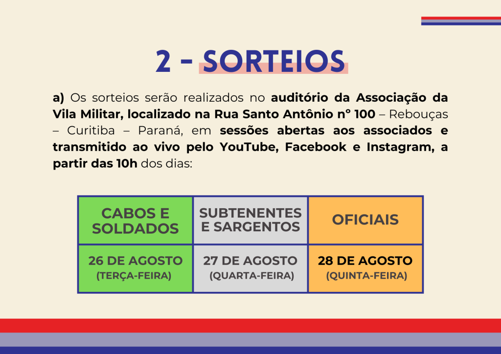 Os sorteios serão realizados no auditório da sede da AVM, localizada na Rua Santo Antônio, nº 100, em Curitiba, sempre a partir das 10h, em sessões abertas aos associados. As atividades também serão transmitidas ao vivo pelas redes sociais da Associação (YouTube, Facebook e Instagram).