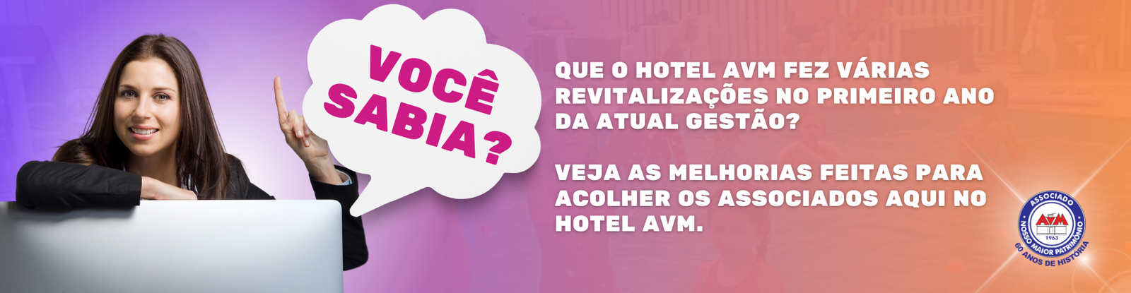 Entre maio de 2023 a fevereiro de 2024, a atual gestão da AVM realizou importantes investimentos para o Hotel AVM de Foz do Iguaçu. Foram várias ações desde renovação de licenças como a importante “Licença Ambiental”, serviço de manutenção em várias áreas do Hotel e aquisição de novos equipamentos, mobiliários e eletroeletrônicos.